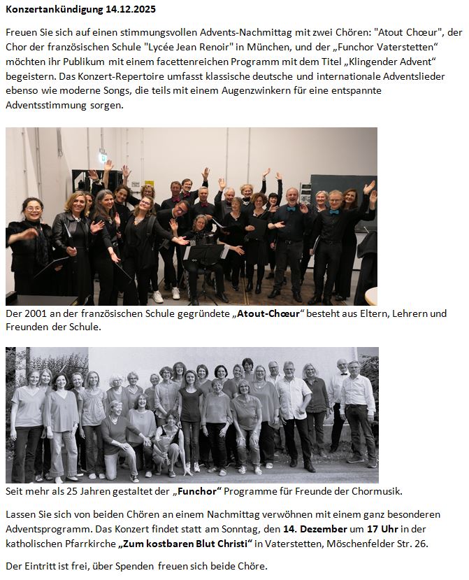 14.12.2025, 17 Uhr – Adventskonzert mit Atout Chœur und Funchor, Kirche zum kostbaren Blut Christi (Möschenfelder Str. 26, 85591 Vaterstetten). Weitere Infos: